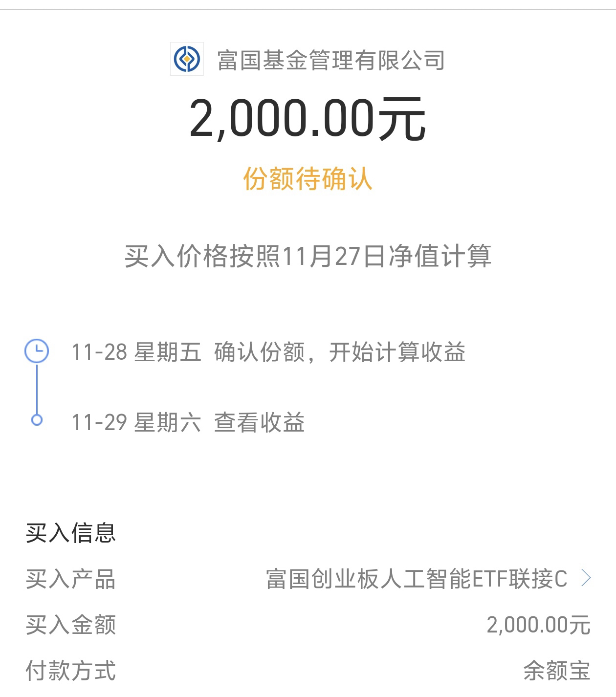 $富国创业板人工智能ETF发起式联接C$ +2000元,基金目前估值上涨了0.84%,今晚吃肉,近期表现的也是非常的优秀,昨天当日上涨了4.37%,近三个月上涨了8.05%,收益率高。基金上涨弹性大,爆发力强。随着权重股业绩爆发、AI商业化落地提速,政策与巨头加持等多重利好核心因素。中长期在算力的需求与国产替代的推动下,增长潜力大。随着市场行情的回暖,资金高低的切换,大量的资金顺周期流入创业板人工智能板块,将迎来新一轮的上涨。长期持有,投资回报率高。