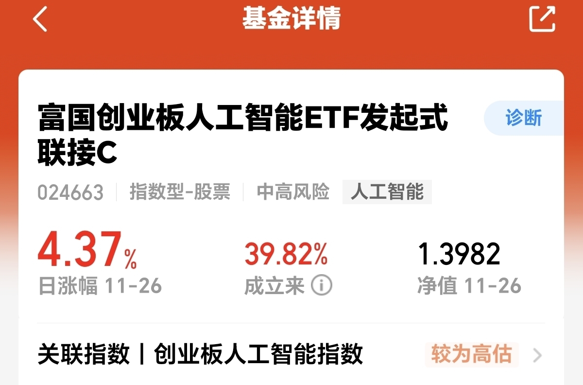$富国创业板人工智能ETF发起式联接C$ 它精准覆盖光模块、AI终端、算力硬件等核心领域,前十大重仓股囊括中际旭创、新易盛等龙头,光模块相关标的持仓占比超41%,深度捕捉产业链红利。政策端六部门发文强化AI融合赋能,“人工智能+”行动持续释放政策红利,机构预判行业处于政策、技术、需求三维共振期。产业端AI算力需求爆发,光模块等核心硬件量价齐升,创业板人工智能指数年内累计涨幅已达52%,富国创业板人工智能成立时间不长,但涨幅也达39.82%,长期收益亮眼,我继续看好!