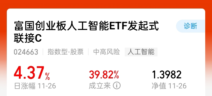 这几天人工智能板块表现是很不错的厉害的,连着涨几天了,$富国创业板人工智能ETF发起式联接C$ 昨天涨了4.37%真的很猛,成立来收益已经接近百分之四十了,现在AI板块的利好消息挺多的,板块景气度一直在提升,我继续保持看好。
