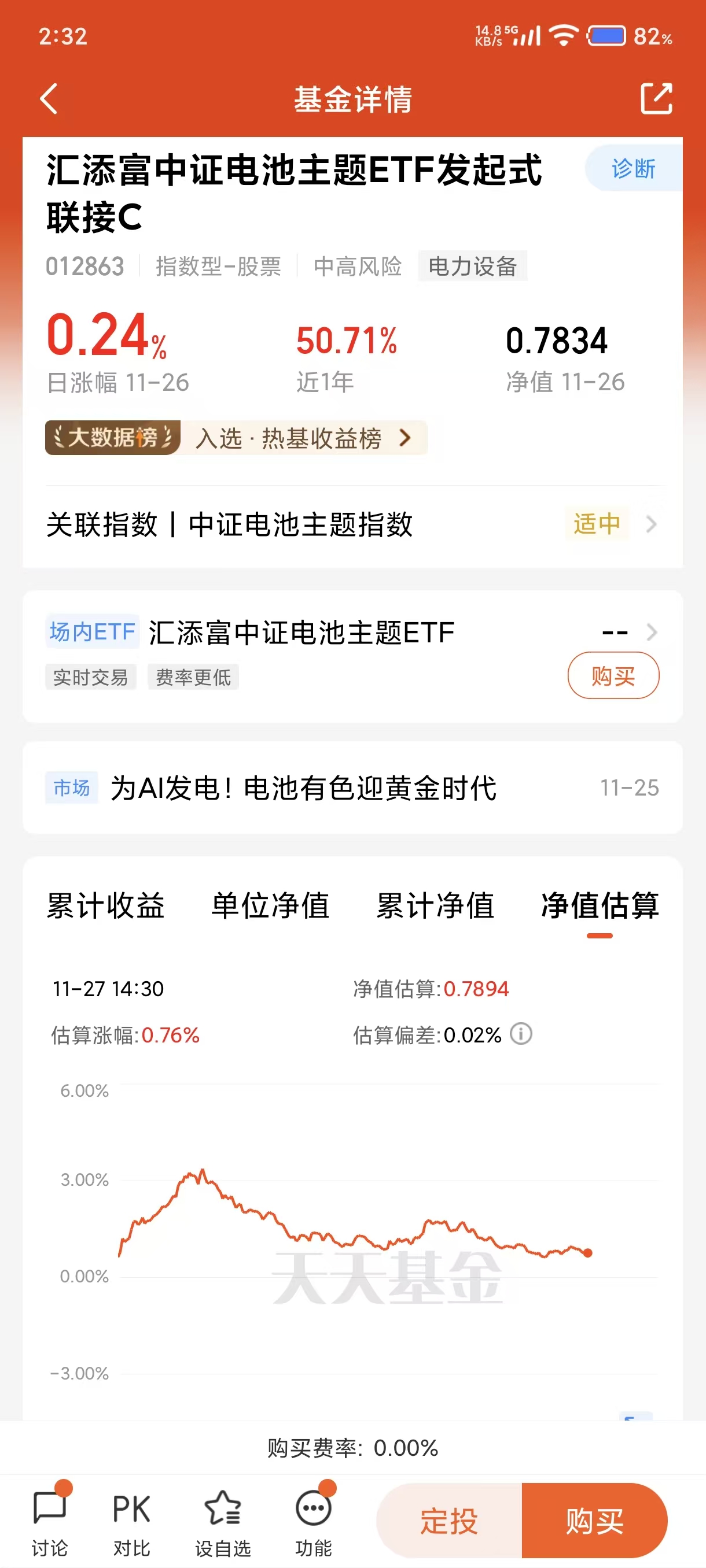今天我选择加仓1000元汇添富中证电池主题ETF联接C(012863 )。这只基金主要跟踪中证电池主题指数,从沪深市场中选取业务涉及电池制造、电池材料、电池设备等细分领域的上市公司,前十大重仓股包括:阳光电源、宁德时代、三花智控、亿纬锂能等。$汇添富中证电池主题ETF发起式联接C(OTCFUND|012863)$