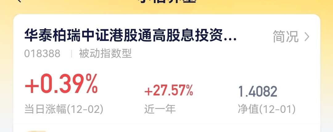 兄弟们,红利行情今天爆了!港股那些高分红的公司股价蹭蹭涨,真是眼馋啊。我以前总觉得投资高大上,但现在发现红利这种实实在在的收益才靠谱,市场热的时候跟涨,平时还有分红垫底。华泰柏瑞有个基金,专门瞄准港股红利,叫中证港股通红利ETF联接C。它跟踪指数,分散风险,买卖像股票一样方便,不用咱们操心选股。趁着行情好,赶紧看看华泰柏瑞,搭上红利快车,别掉队,赚点小钱也开心。