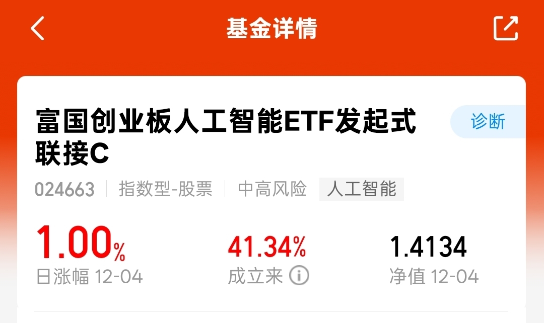 近期的行情还是不错的,今天目前也是全红的,很舒服呀,$富国创业板人工智能ETF发起式联接C$ 昨天涨了一个点那,表现很好呀,今天的估值也来到了0.8%了,最近人工智能板块的热度还是很高的,“人工智能+”行动不断推进中,人工智能板块迎来市场和政策双重共振,今天我继续加点。