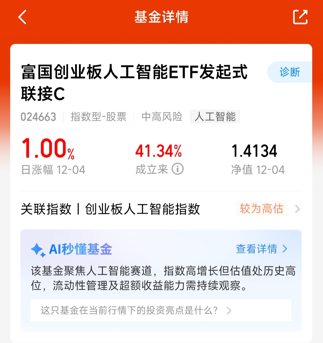 明显改善。在政策与创新双重赋能下,人工智能产业景气度持续向好。$富国创业板人工智能ETF发起式联接C$ 今日估值上涨0.89%,昨日净值提升1.0%,近一年收益率已累计达到41.34%,走势平稳向上。该产品主要投向创业板人工智能主题ET F,覆盖产业链关键领域如芯片、算力基础、数据服务等公司。板块在多重利好支撑下,趋势依然积极,持续关注。