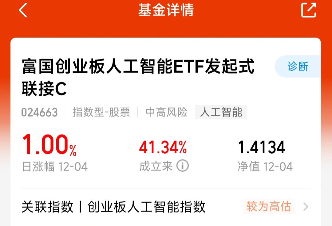 市场做多热情显著回升!早盘经历小幅低开,随即在买盘推动下强势上扬,沪深及创业板指数悉数收涨,反弹格局明确。人工智能赛道在政策引导与技术迭代的共振下,正不断释放积极动能。紧密跟踪该领域的$富国创业板人工智能ETF发起式联接C$ 延续涨势,今日估值上升0.89%,昨日净值增长1.0%,近一年回报达41.34%,展现出稳健的向上趋势。该基金通过布局目标ETF,聚焦创业板中与人工智能强相关的企业,涵盖AI芯片、算力、数据服务等核心环节。当前板块基本面与市场情绪同步修复,持续看好!