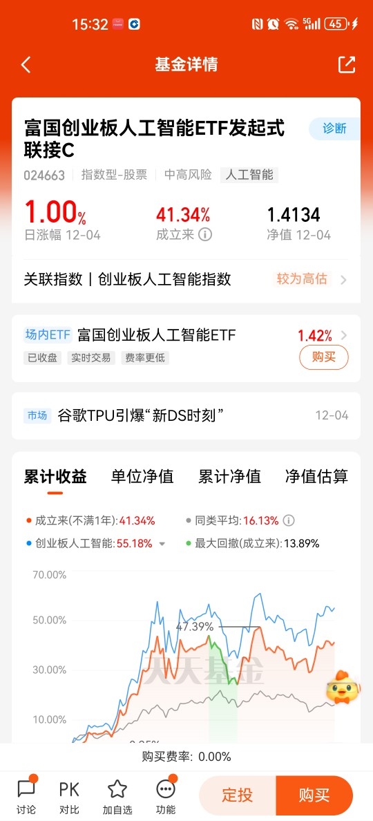 这阵子翻了下帐户,富国创业板人工智能ETF联接C这几个月展示真不赖近6个月涨了4
