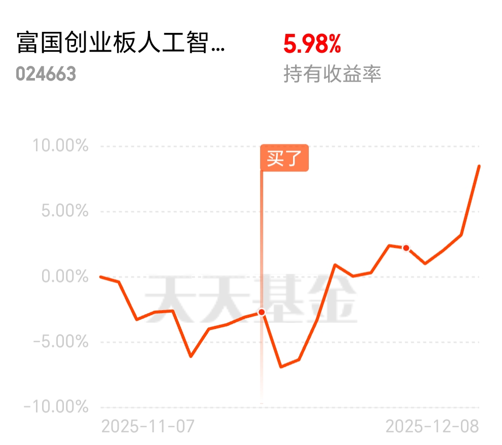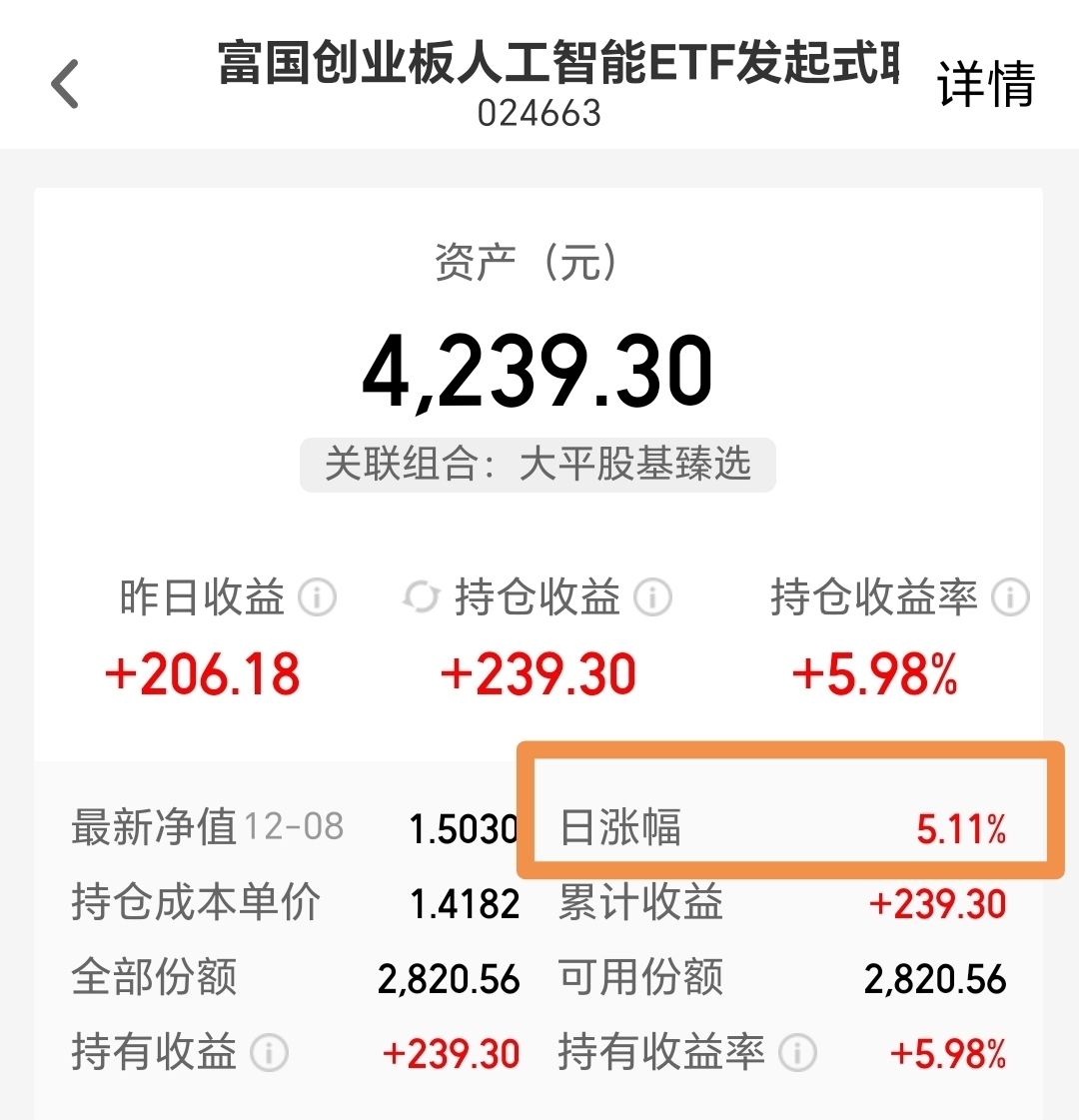 昨天的行情太香了,A股科技基本全面开花,其中AI产业链表现优秀,我布局的$富国创业板人工智能ETF发起式联接C$ 单日涨幅暴涨5.11%,这有些出乎意料了,因为板块涨幅3%左右,这个超额收益还是很亮眼的。看了一下持仓,主要布局AI龙头,光模块、芯片这些硬科技风口全抓住了。