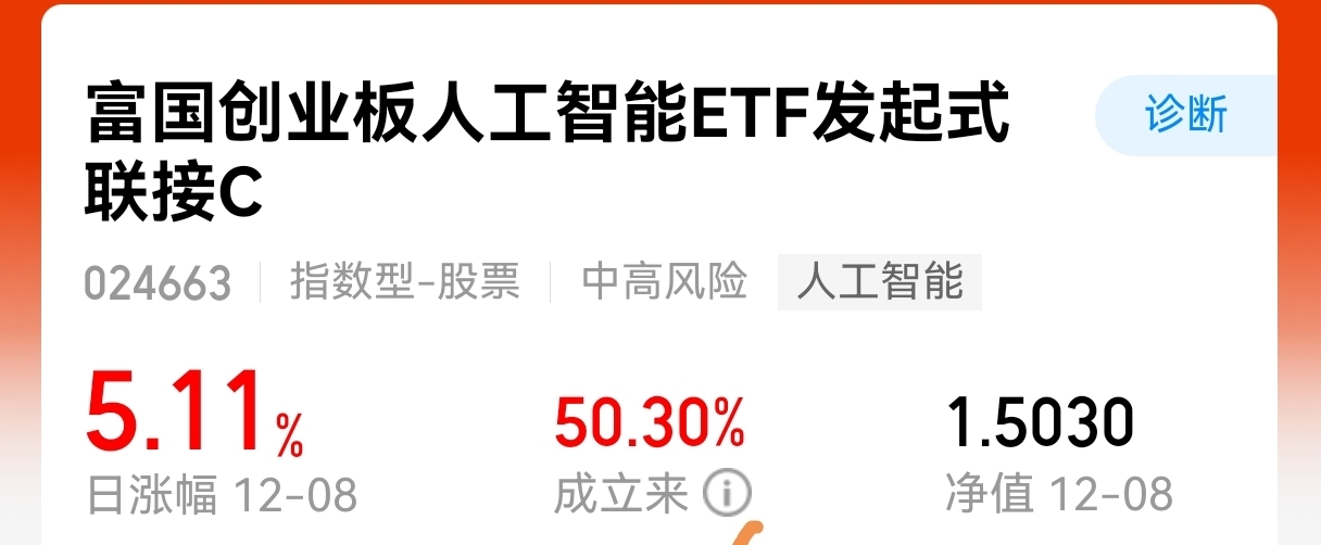 大盘有所震荡,这创业板人工智能依然很强,今日继续上涨,$富国创业板人工智能ETF发起式联接C$ 目前涨幅2.40%,近一周涨幅5.96%,近三个月涨幅16.48%,业绩优秀,远超同类涨幅,太给力了,跟踪的创业板人工智能指数重点覆盖“光模块+算力芯片+边缘计算+操作系统”等底层技术环节,指数前十大重仓股包括中际旭创、新易盛、天孚通信等,焦国内AI产业源头创新与应用落地,当前潜力很大,应用很广泛,继续追加1000。