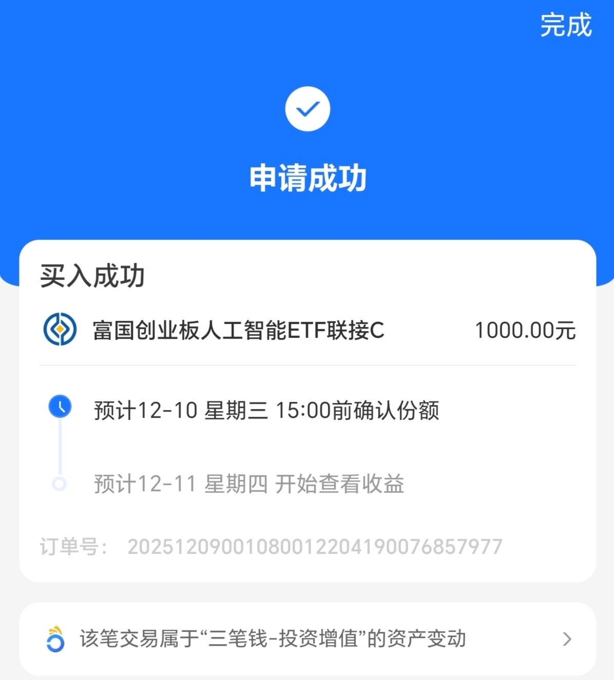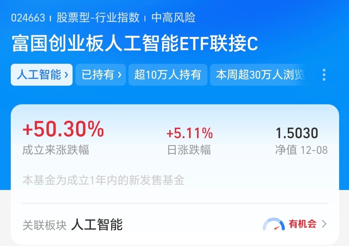 今天股市高开低走,CPO概念继续走强!消息上,老特当地时间12月8日在社交媒体上发文宣布,美将允许英伟达向我们出售其H200人工智能芯片,但对每颗芯片收取一定费用。美正在敲定相关安排细节,同样的安排也将适用于超微半导体公司、英特尔等其他人工智能芯片公司。利好ai硬件,$富国创业板人工智能ETF联接C$$富国创业板人工智能ETF发起式联接C$ 紧跟创新板人工智能,布局光模块等ai硬件,昨天涨5.11%,今天估值涨2个多点,成立来50多个点,每次优秀,我今天继续买点,今年光模块还有行情,我等着吃肉。