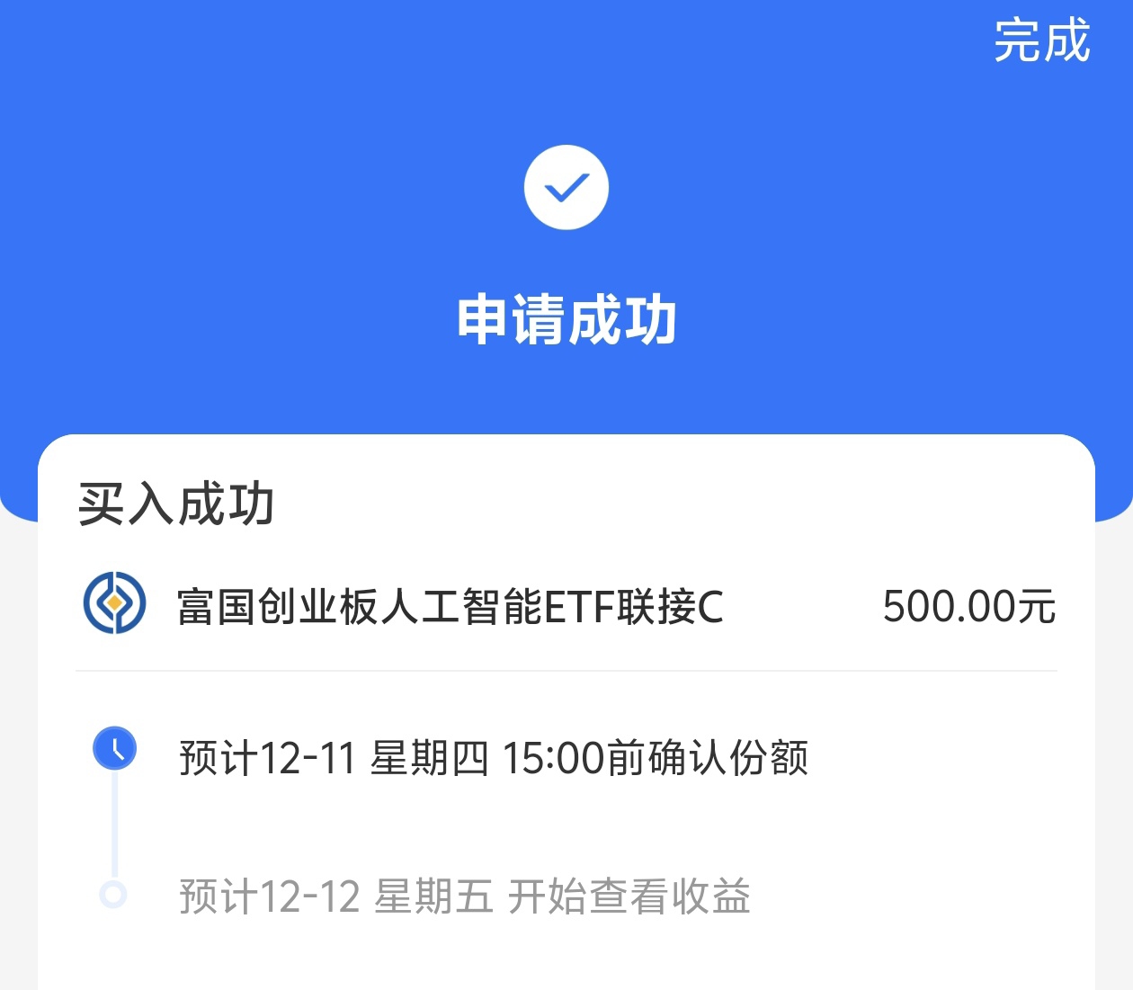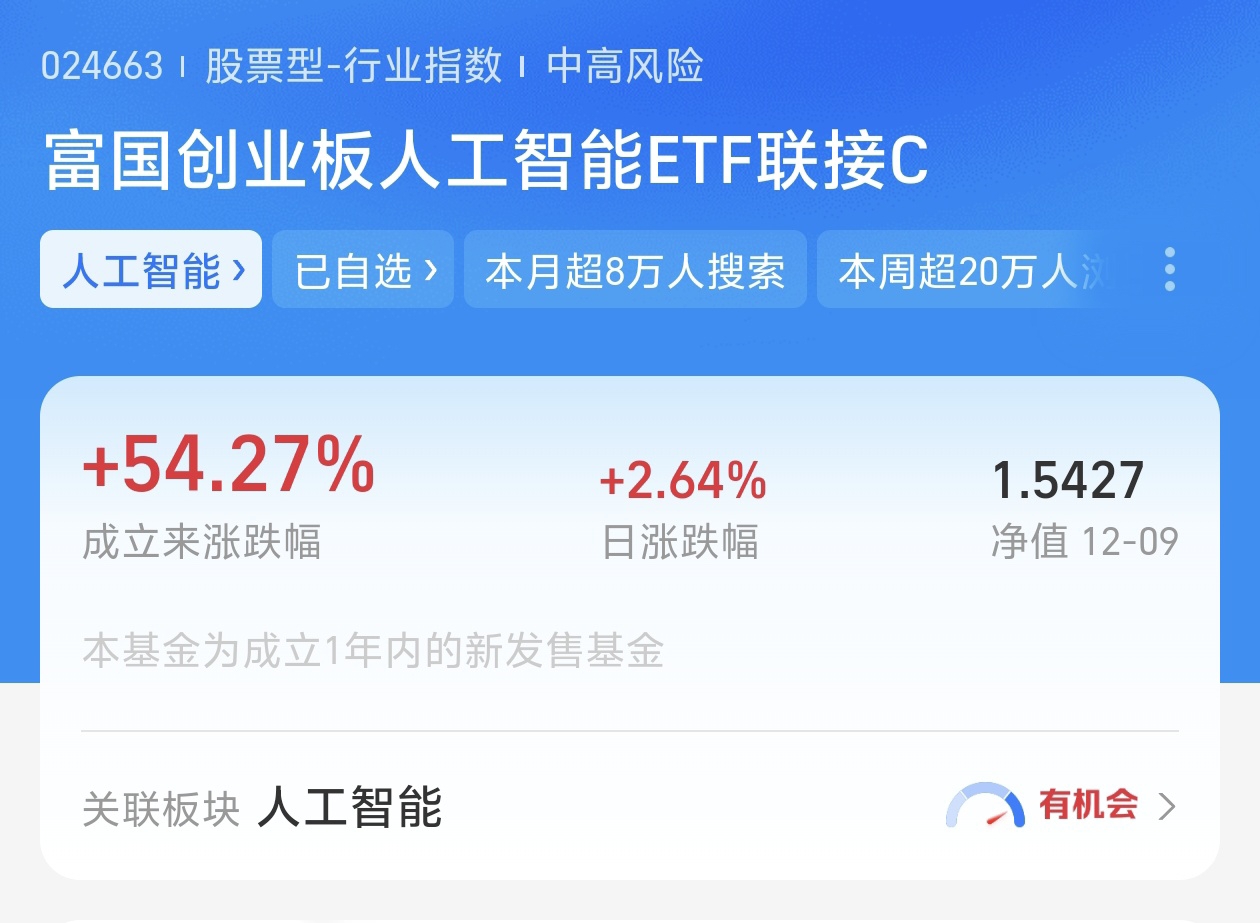 行情回落,三大指数小幅回调。今天我也是加仓了$富国创业板人工智能ETF发起式联接C$ 500元,基金近期表现的也是非常的不错,昨天单日上涨了2.64%,近一个月上涨了11.36%,成立不到半年的时间收益率就高达了5