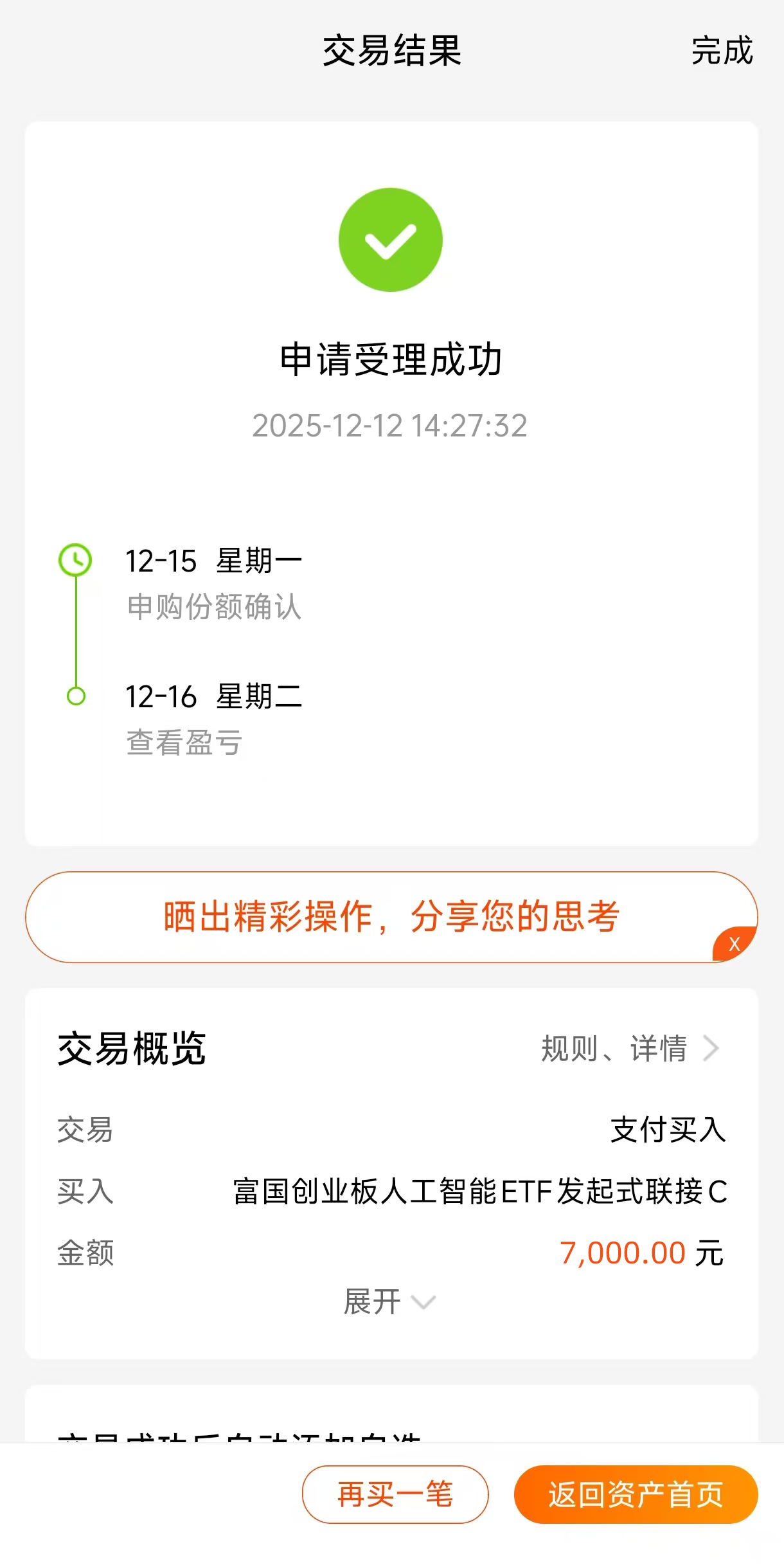 很多人看到摩尔线程什么的,都想投AI,其实有个更简单的方式,就是直接买$富国创业板人工智能ETF发起式联接C$(024663)。理由其实很简单,这个指数基金把创业板里的AI相关个股全部打包了,像什么“易中天”就都在里面,买这一只基金,保你不会错过AI的机会。说白了,就是防止错过,你可以不大买,但是你一点都不买,肯定得后悔。#国际银价涨疯了!现在上车还来得及吗?#