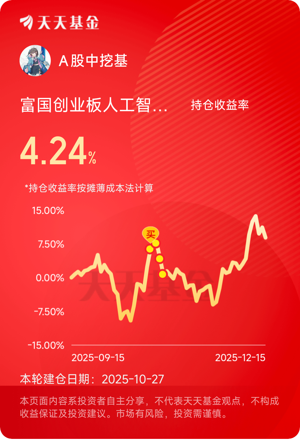 最近市场情绪偏弱,科技成长板块小幅调整,我持有的$富国创业板人工智能ETF发起式联接C$ 近期也不断逼近成本线,还好前期逢低补了一些仓,现在还略有盈余。