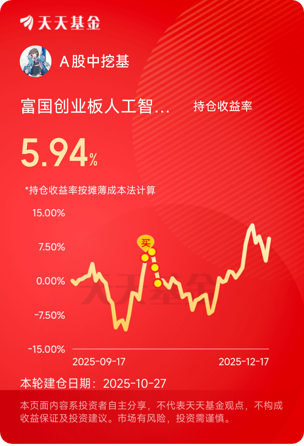 昨天创业板人工智能板块涨超4%,我持有的$富国创业板人工智能ETF发起式联接C$ 也吃到了大肉,虽然今天有个小回踩,但我依旧长期看好,且坚定选择借道指数标的来布局。