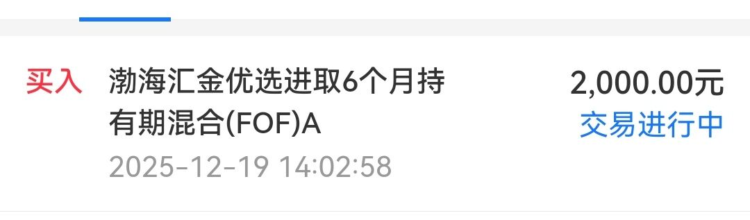 4、$渤海汇金优选进取6个月持有混合发起(FOF)A(OTCFUND|018674)$,买入2000元