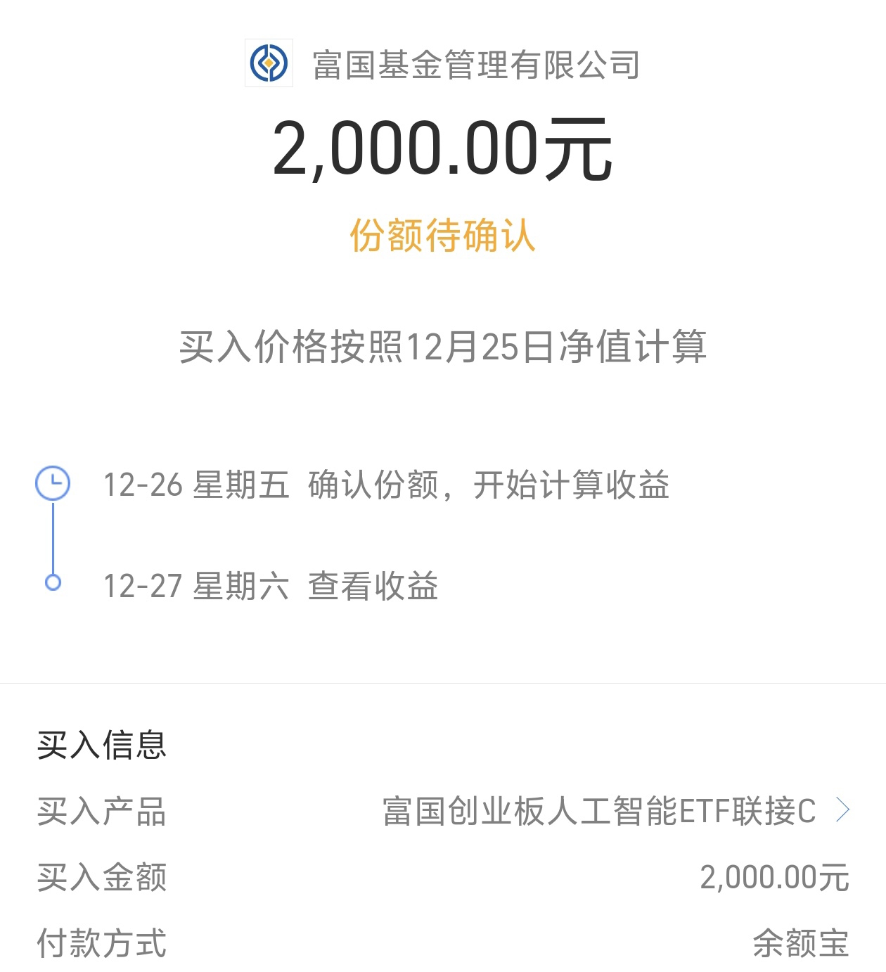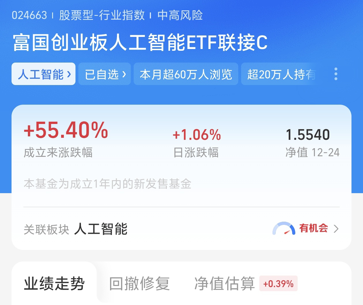 行情上涨,三大指数小幅上涨。今天我也是加仓了$富国创业板人工智能ETF发起式联接C$ +2000元,基金估值上涨了0.38%,今晚吃肉,近6个月的收益率高达55.4%,盈利能力强。基金布局人工智能板块,当前处于“算力刚需+应用落地+政策加持”的共振上升期,全球A算力需求上涨,算力基建与需求爆发。整体人工智能板块呈现结构性上涨,随着技术的迭代与商业化的提速,将迎来新一轮的上涨。长期持有,投资回报率高,期待后期收益。