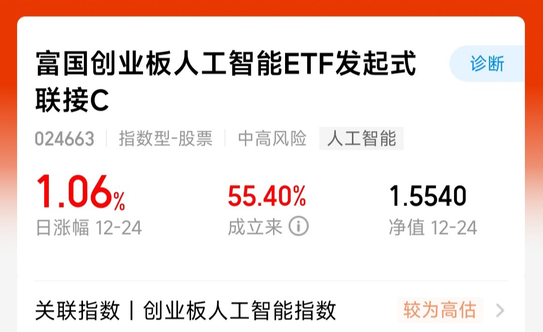 在这样的结构性行情中,科技内部分化明显。我持有的$富国创业板人工智能ETF发起式联接C$ 今日出现回调。历史业绩表现,该基金昨日净值上涨1.0 6%,近一年收益更是达到55.40%,长期业绩彰显出较强的增长韧性。人工智能是驱动未来的核心科技趋势,短期的市场波动不改长期向好的产业逻辑。趁着回调,我选择继续布局。