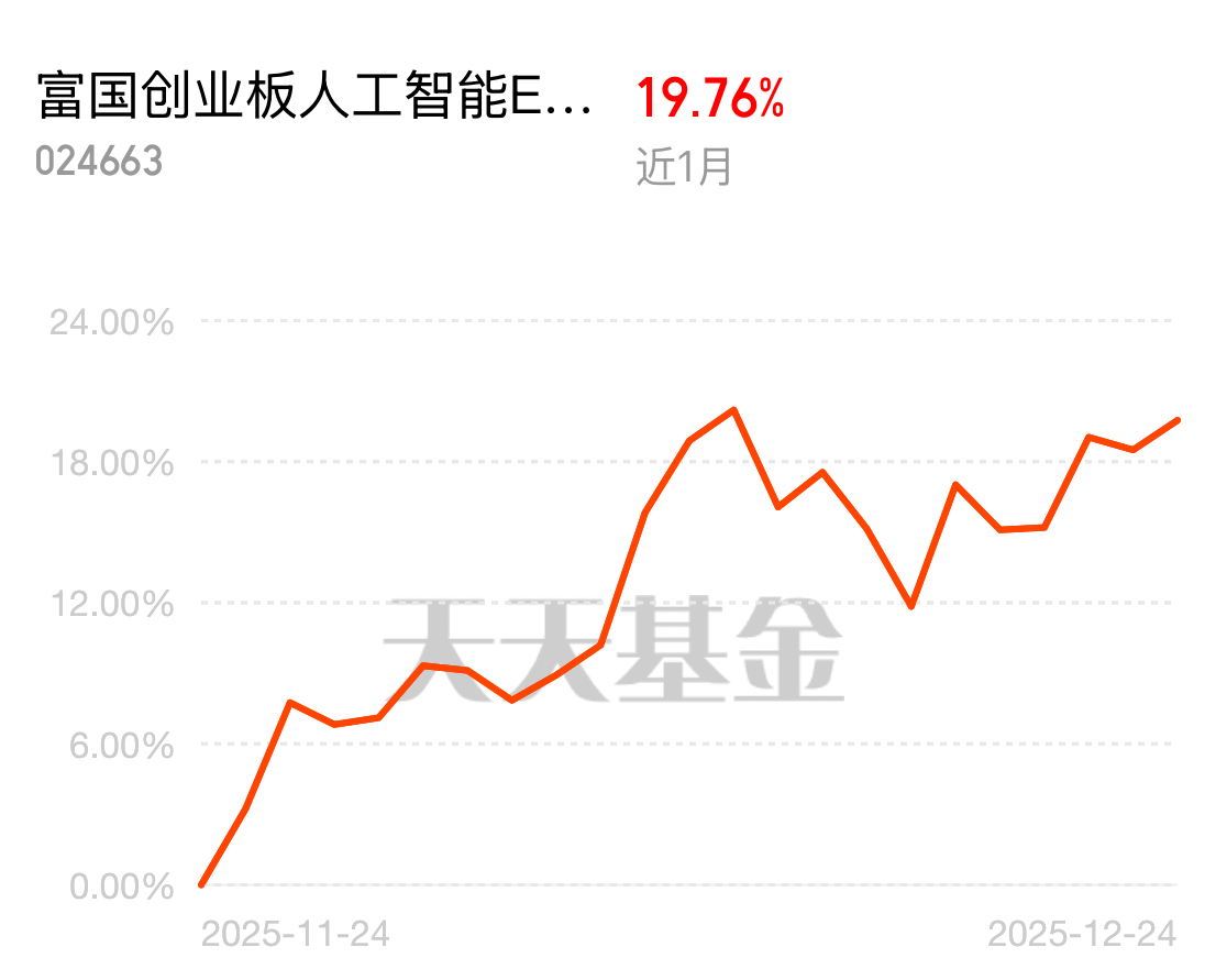 慢牛加快,这周基本都回血了,情绪好转,不过我觉得也不能太激进,别一把冲科技股抓跨年行情。虽然我也看好跨年行情,但也不会一把梭哈,继续定投一份$富国创业板人工智能ETF发起式联接C$ 创业板人工智能指数近段时间表现低迷主要是因为产品侧重点不同,指数主要聚焦算力、芯片赛道,从本周的行情来看,芯片算力轮着来,经过前期的调整,创业板人工智能指数估值性价比也跌出来了,轮动补涨空间打开。AI算力激增,光模块也会涨,最终都需要靠芯片提供算力,都是AI确定性较强方向,弹性大我就继续低买高卖起来。