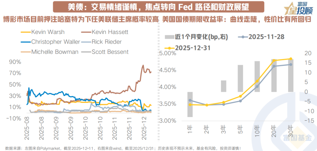近期超预期的美国三季度GDP、密集的美联储人事变动和降息言论、日元企稳回升等影响交织带动美债利率曲线长端性价比修复。美联储近期公布12月FOMC会议纪要显示,有关联邦基金利率目标区间进一步调整的幅度和时间,部分与会者认为“(在本次会议下调目标区间后)在一段时间内保持目标区间不变可能是合适的”,票委内部存在一定分歧,货币政策指引方向相对谨慎,其相对于风险资产的风险回报比或偏低。1月美联储人事变动也为债市铺垫了更为谨慎的交易氛围,焦点转向Fed路径和财政展望。
