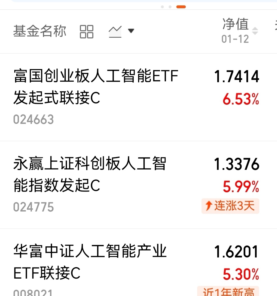 $富国创业板人工智能ETF发起式联接C$ 今天大涨6.35%,吊打同类产品和沪深300指数,超额收益直接拉满了。