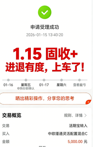 今日a股有些降温,但部分方向轮动上涨,结构性机会存在, 我分散配置低波固收+参与行情。 中欧瑾通我持有一段时间,体验不错,这段时间以来基本涨4天调1天的节奏,大多时候都在慢慢涨,偶尔调整也是蓄力。