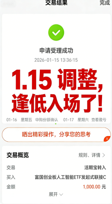 我此前做了一次波动,短短几天赚了超10%。现在AI行业正迎来技术突破与算力升级的双重风口,重构芯片、高阶TPU等新技术不断落地,算力硬件、大模型等核心领域持续爆发,富国创业板人工智能精准踩中产业趋势,紧跟创业板人工智能指数,把AI赛道的红利实实在在吃到手。