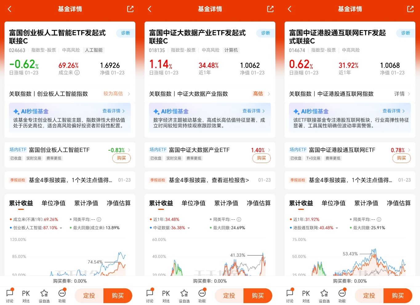我自己关注的基金,没选太复杂的,就挑了几只贴合赛道、又相对稳的。比如富国中证港股通互联网ETF联接C(014674),直接布局港股互联网龙头,腾讯、美团这些公司既有AI技术储备,又有成熟的用户和商业化场景,比纯AI概念股更踏实,近一年的表现也没让人失望。还有富国中证大数据产业ETF联接C(018135),大数据是AI的“粮草”,底层算力和数据服务的需求只会越来越大,相当于布局AI的基础盘,波动相对小一些,适合慢慢拿。