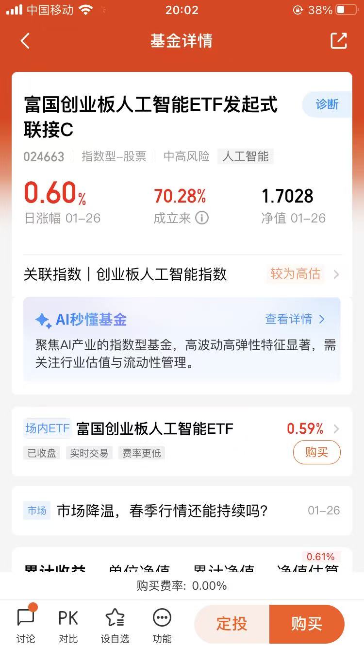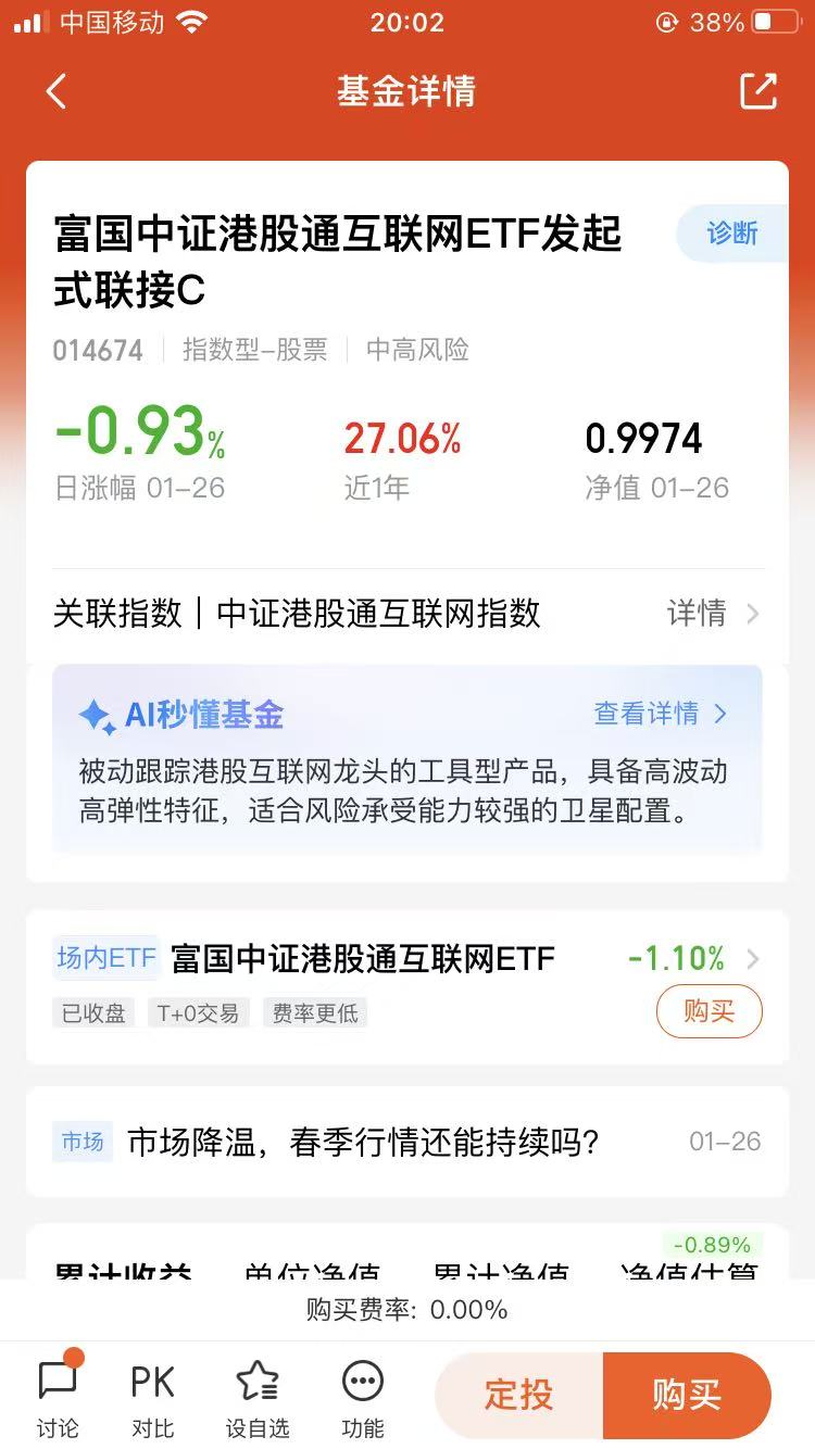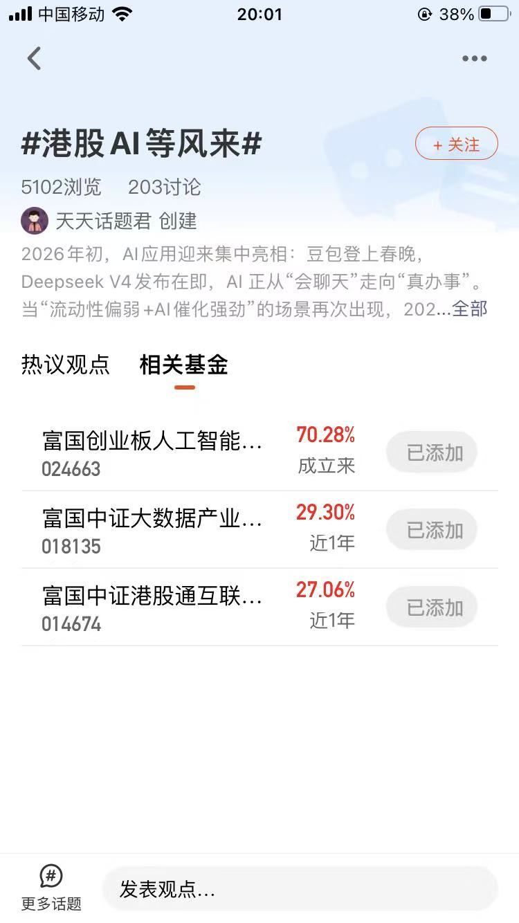总的来说,港股和科技板块现在就处在一个“机会大于风险”的阶段。不用被短期波动牵着鼻子走,盯着估值、基本面和资金面这三个核心,耐心持有,2026年大概率能有不错的回报。毕竟投资这事儿,慢一点,反而更稳一点。$富国中证港股通互联网ETF发起式联接C(OTCFUND|014674)$$富国中证大数据产业ETF发起式联接C(OTCFUND|018135)$$富国创业板人工智能ETF发起式联接C(OTCFUND|024663)$或有望在本轮景气周期中继续带来惊喜,值得各位朋友多加关注。@富国基金管理有限公司