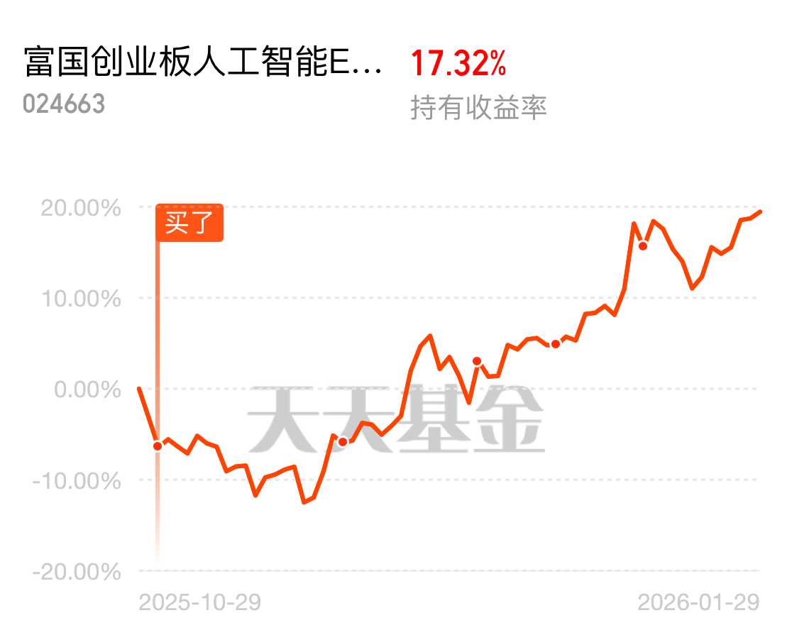 虚惊一场,牛还在,小羊的创业板人工智能估值大涨超2%,怕什么!今天市场的波动过于激烈,很多人都恐慌了,下午开盘逐渐回暖,创业板人工智能板块低开高走,逆势大涨,真是虚惊一场,$富国创业板人工智能ETF发起式联接C$ ,目前估值2.24%,该基金覆盖了人工智能产业链的核心企业,受益于AI硬件、边缘计算等高景气赛道,前十大重仓包含多只AI芯片、智能设备领域的龙头企业,也是今天逆势反超的原因之一,小羊目前已经赚17.22%了,但个人认为这远没有到顶,当前芯片涨价大周期,叠加国产替代进程加速,后续创业板人工智能领域的上涨空间依旧较大,潜力无限,小羊继续关注,继续持有。