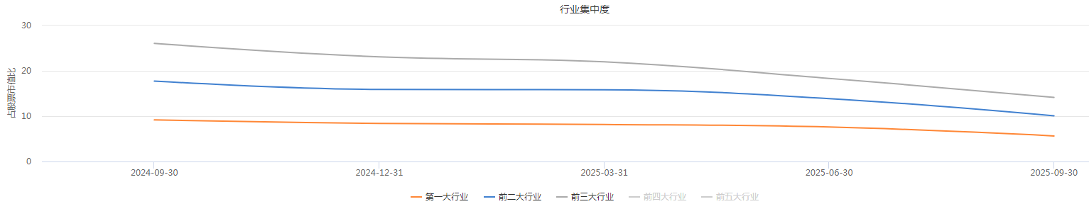 Choice统计显示,第一大行业集中度长期低于10%,2025Q3仅有5.64%,持续降低。