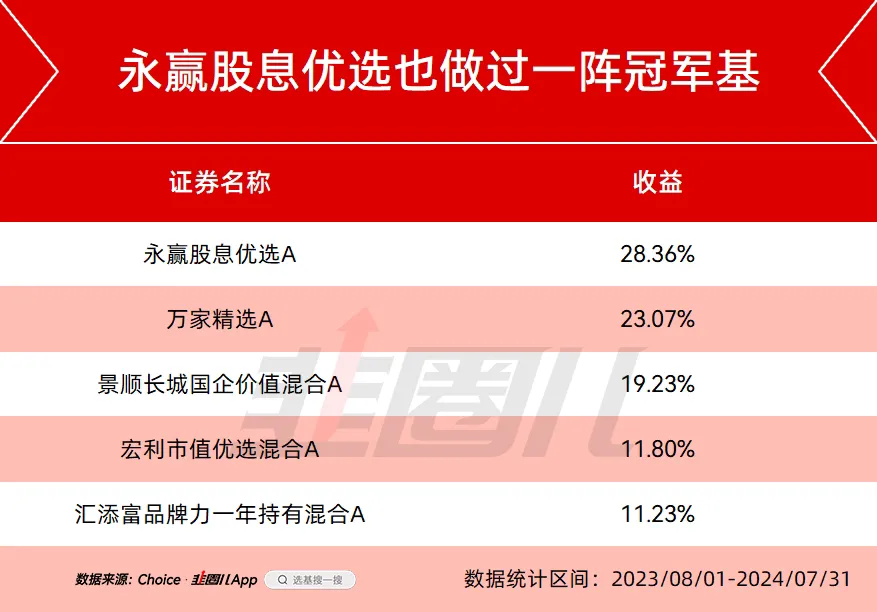 我回去也看了一下,截至2024/6/30,当时永赢股息优选的收益率是第二名,后面在7月、8月末,永赢股息优选A近一年的收益率在偏股混里也做过冠军。