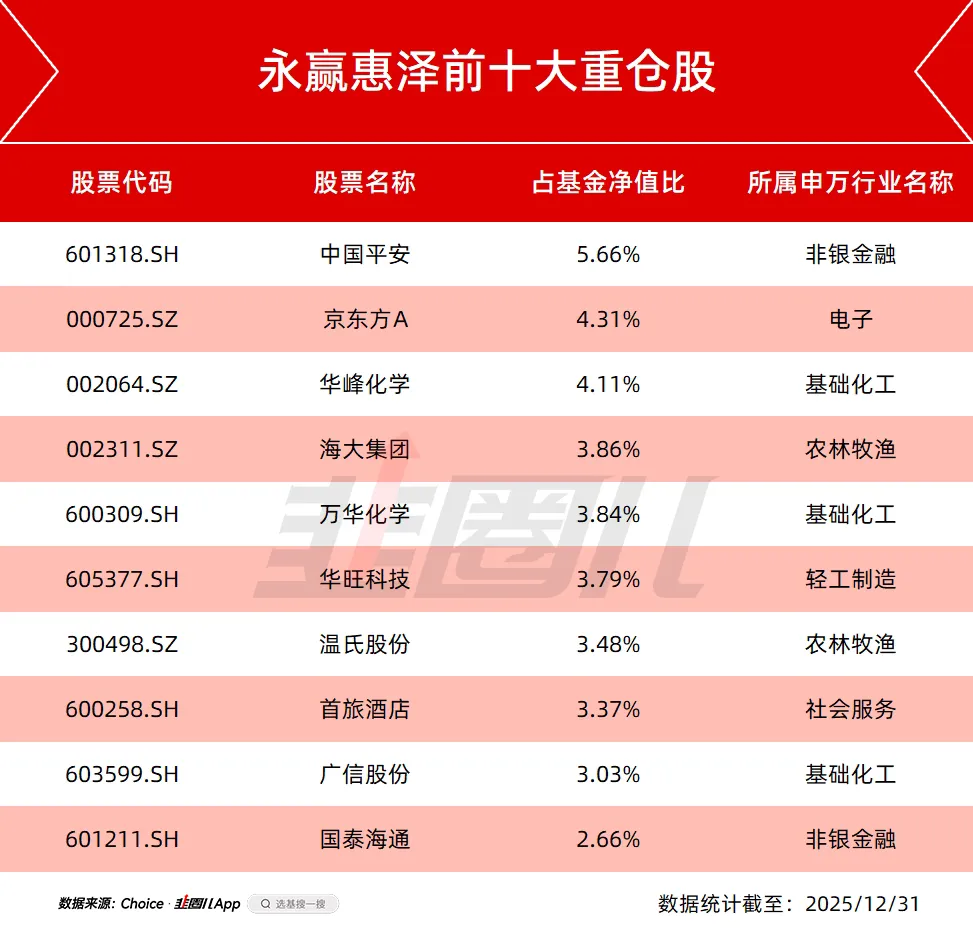 王乾从2025年1月开始管理永赢惠泽一年,其重仓股主要集中化工、保险、证券以及对企业盈利存在较大预期差的面板和消费上。