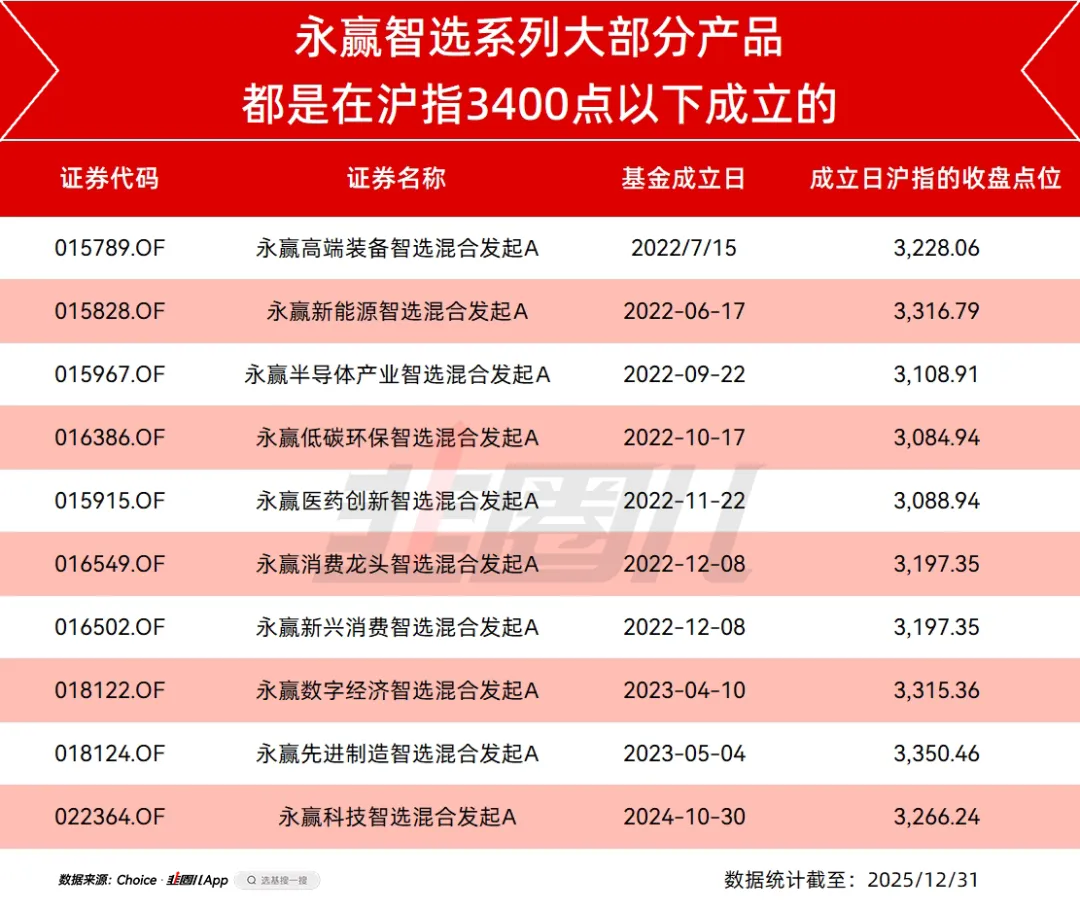 但我们要关注的是,永赢智选系列16只产品,有10只成立在2022-2024年,那时候市场并没有今天的热度这么高,沪指点位也比现在要低很多,更还没有流行科技组合,以及对前沿科技行业的细分化配置。