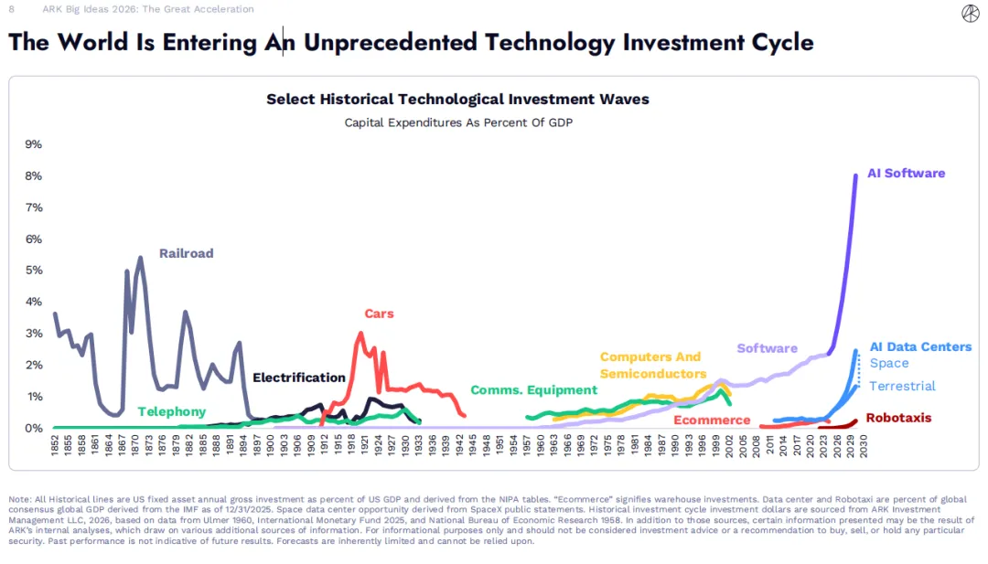 而且Ark预测,AI将引发一场史无前例的资本投资狂潮,其规模将远超铁路、汽车和互联网等历史上所有的技术革命。