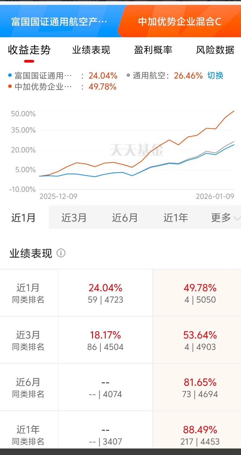 数据会说话,排名显实力。 在一众航天军工主题基金中,$富国国证通用航空产业ETF发起式联接A$ 近一个月收益24.04%,$中加优势企业混合C$ 以近一月近50%的收益率一骑绝尘,稳居同类前五。这不是偶然,这是对产业浪潮的精准驾驭。