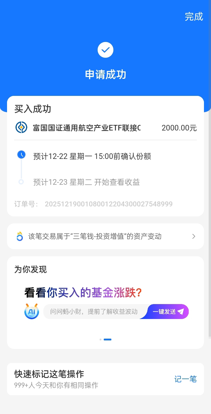 今天市场行情高开高走表现还是很不错的,最近总能刷到一些关于低空经济的消息,这个赛道现在很火热呀。今天+2000$富国国证通用航空产业ETF发起式联接C$ ,昨天涨了1.73%,今天也预计有波不错的涨幅,表现还是实打实可以的,现在低空经济很热门,板块利好消息也有很多,长期来看还是很看好的,继续加油!
