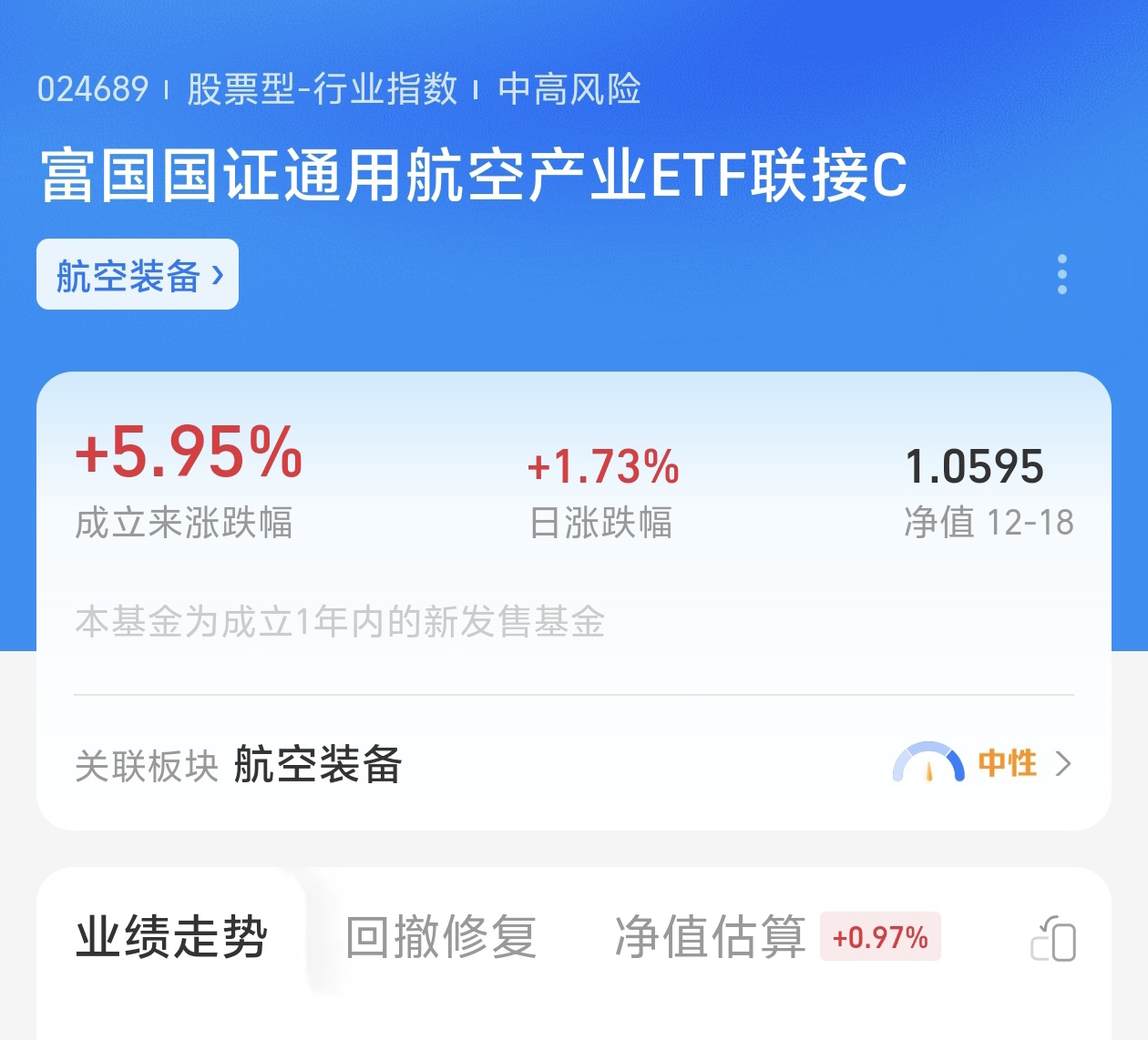 行情上涨,A股三大指数小幅回落。今天我也是加了$富国国证通用航空产业ETF发起式联接C$ +2000元,基金估值上涨了0.97%,昨天在行情回落的状态下逆势上涨1.73%,基金成立以来上涨了5.95%,收益率高。目前航空产业正处于政策扶持+技术突破+需求爆发的共振期,随着低空空域管理改革持续深化,航空产业行业景气度上行。叠加航空市场需求多元爆发,对产业构成基本面支撑。将迎来新一轮的上行周期。长期持有,投资回报率高,期待后期收益。