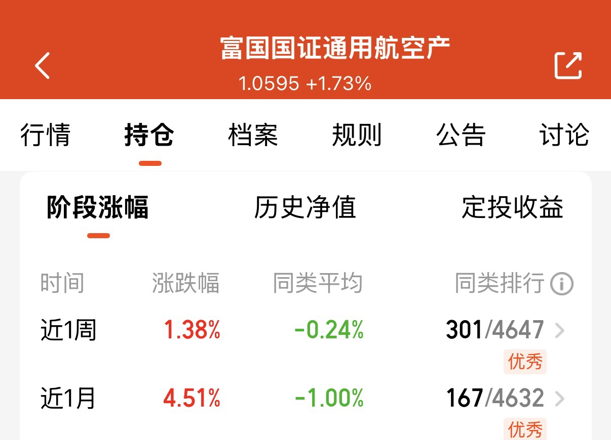 尾盘操作:今天权益市场不错,三大指数均上涨,航空航天方向$富国国证通用航空产业ETF联接C$ 又是有不错的涨幅,妥妥的新主线,虽然今天不是领头羊,但商业航天是近期市场中为数不多走出持续性行情的板块,国证通用航天近一个月4.52%,在同类里面上升到一哥,行业催化不断,在朱雀三号成功入轨之后,长征十二甲也快要迎来首飞了,并会尝试一级火箭的垂直回收。