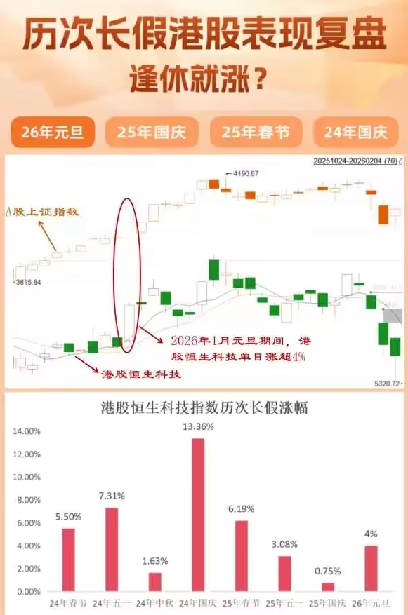 24年春节、五一,25年元旦,恒科长假后都有不错涨幅
