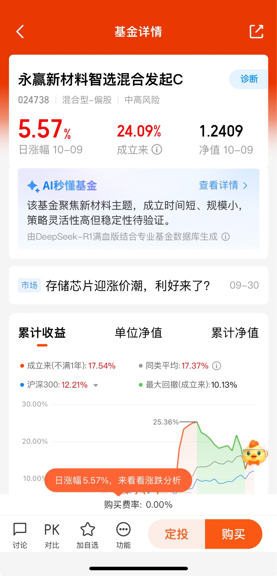 $永赢新材料智选混合发起C$今天开门红收5.57%,近一个月收11.13%表现优