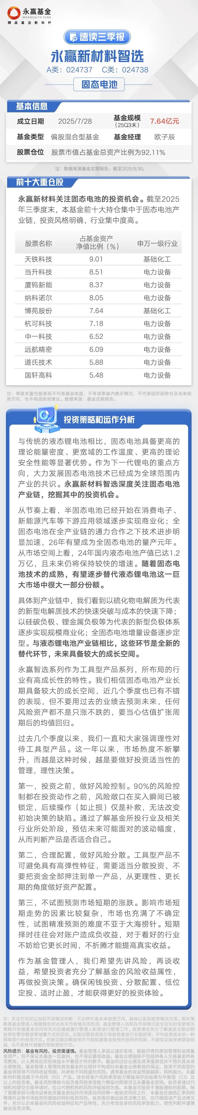 永赢新材料智选关注固态电池的投资机会。截至2025年三季度末,本基金前十大持仓集中于固态电池产业链,投资风格明确,行业集中度高。