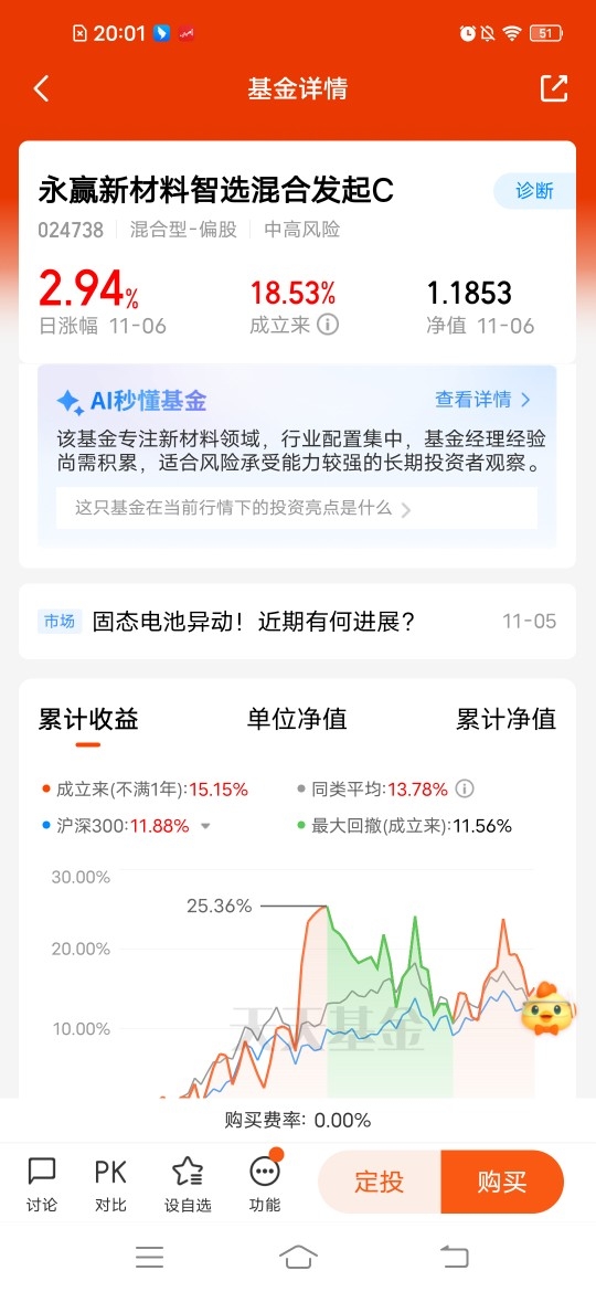 $永赢新材料智选混合发起C$刚成立更有活力,今晚更新涨幅2.94%,成立以来累积