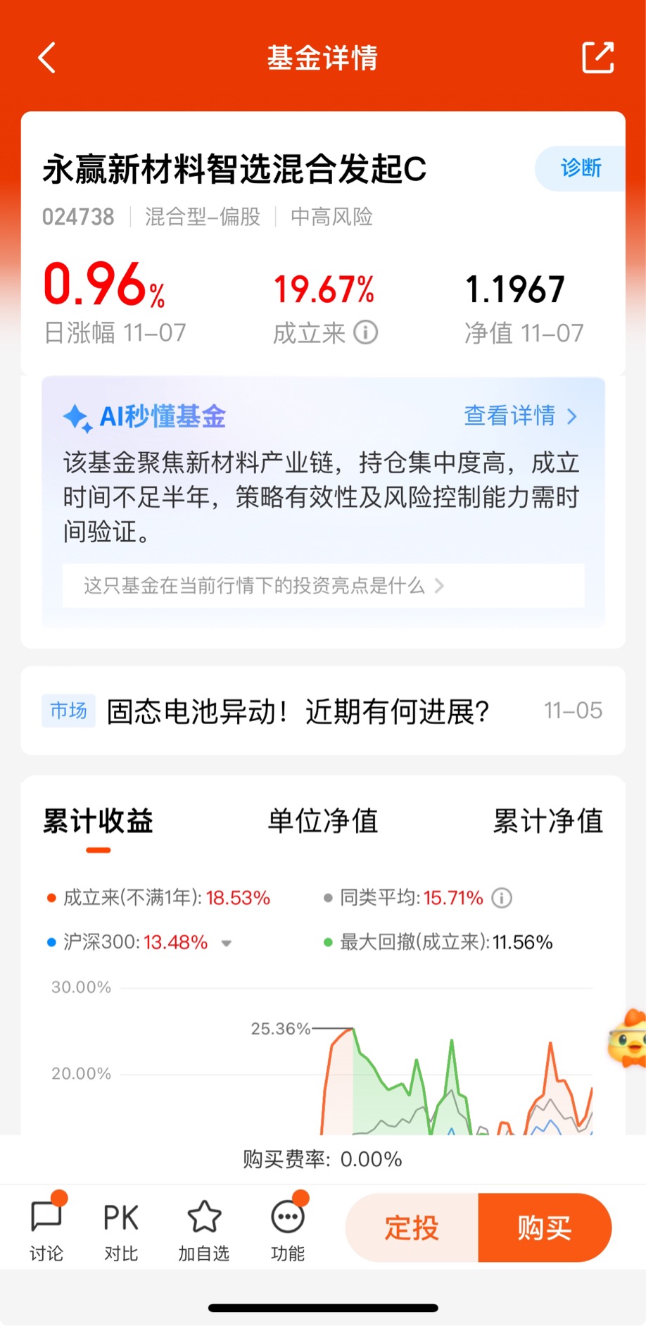 $永赢新材料智选混合发起C$今天收0.96%,近一个月收1.81%,近3个月收1