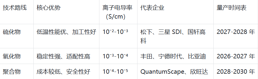 当前固态电池形成三大技术路线并行发展的格局,各路线优势与进展差异显著: