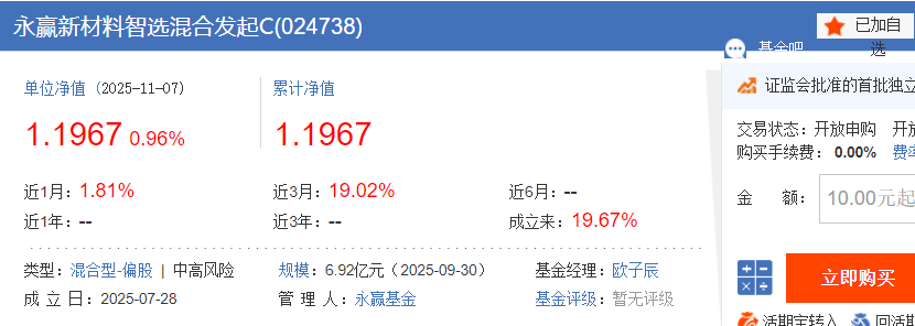 永赢新材料智选混合发起 C 成立于 2025 年三季度,是永赢基金在新材料领域的核心布局产品,股票资产占比 60%-95%,专注于投资 “材料创新 + 产业升级” 相关标的,涵盖固态电池材料、半导体材料、高端复合材料等细分领域。