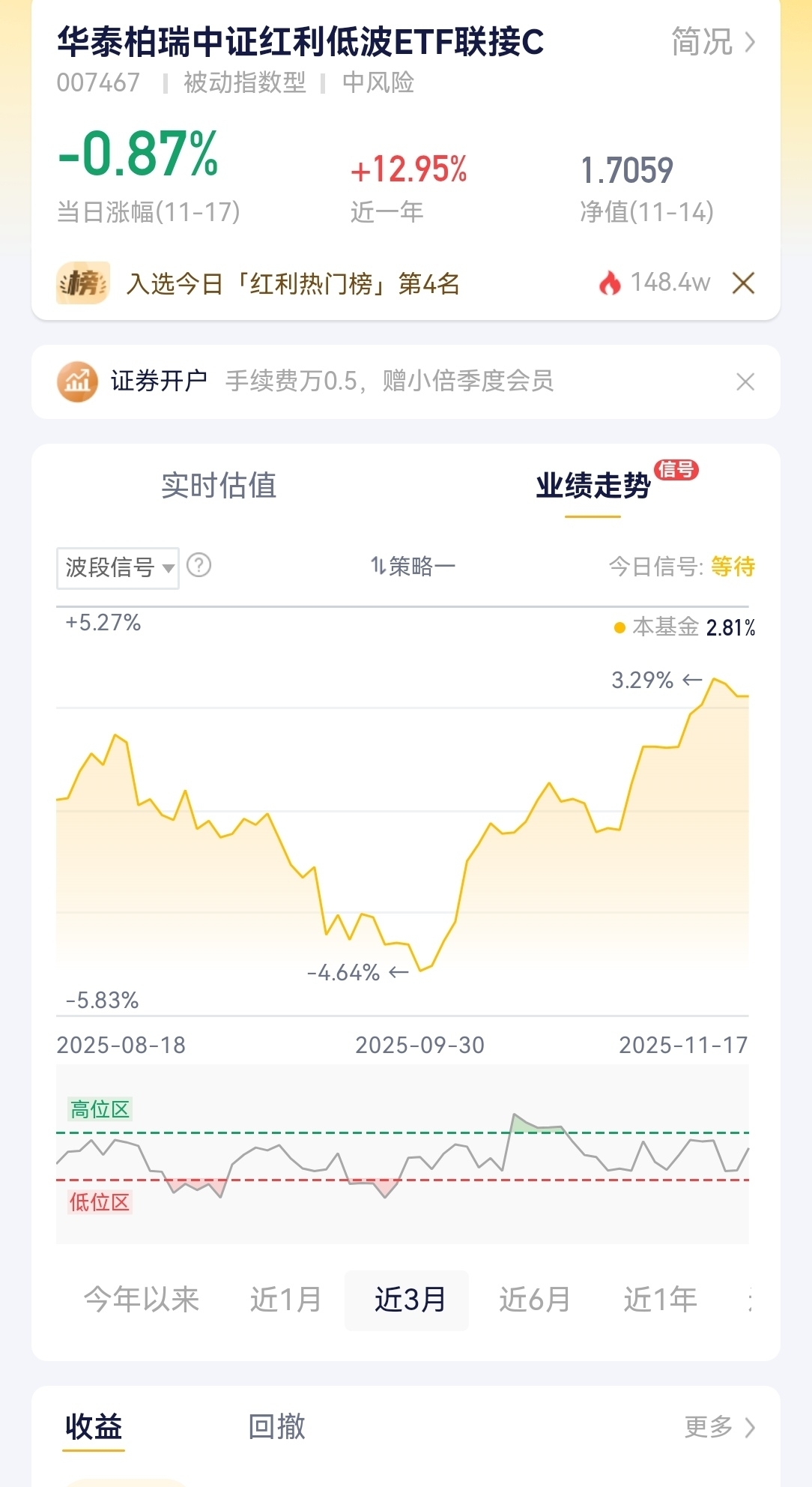 今天红利低波又走出了平稳的走势,在当下的市场环境里,这种“慢涨少跌”的风格太让人安心了!低利率时代,能有稳定分红还不用承受大波动的投资,真的不多见。红利低波的成分股覆盖了不少稳增长板块,抗风险能力强,就算市场震荡也不容易大幅回撤。华泰柏瑞的这款产品刚好贴合这个策略,跟踪误差小,能精准把握板块收益,C类没有申购费,平时闲钱放进去,既能赚分红,又能等着净值慢慢涨,性价比很高。