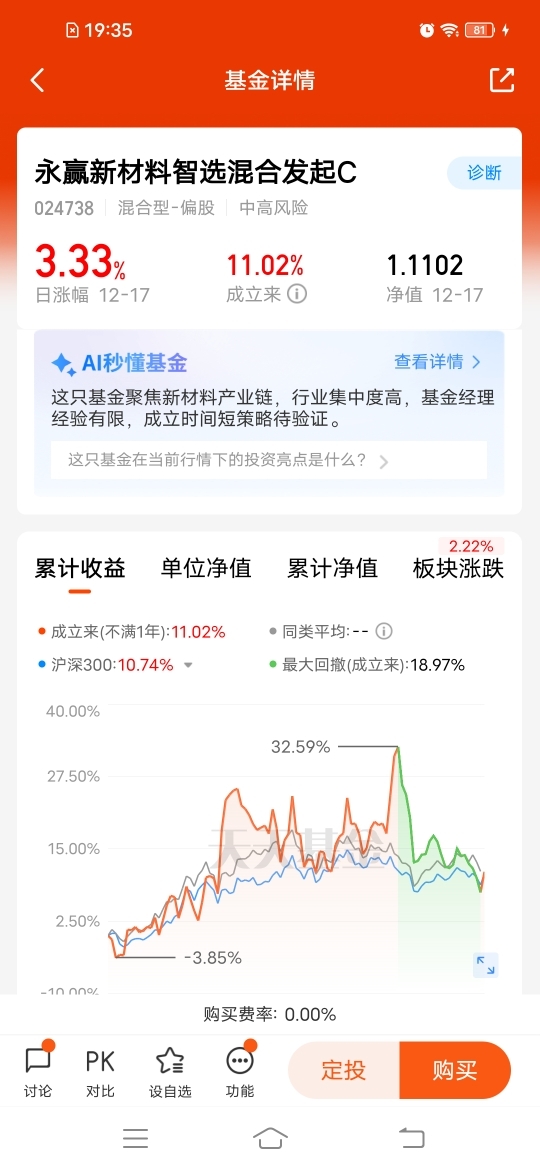 $永赢新材料智选混合发起C$今晚更新涨幅3.33%,刚成立没多久累积涨幅11.0