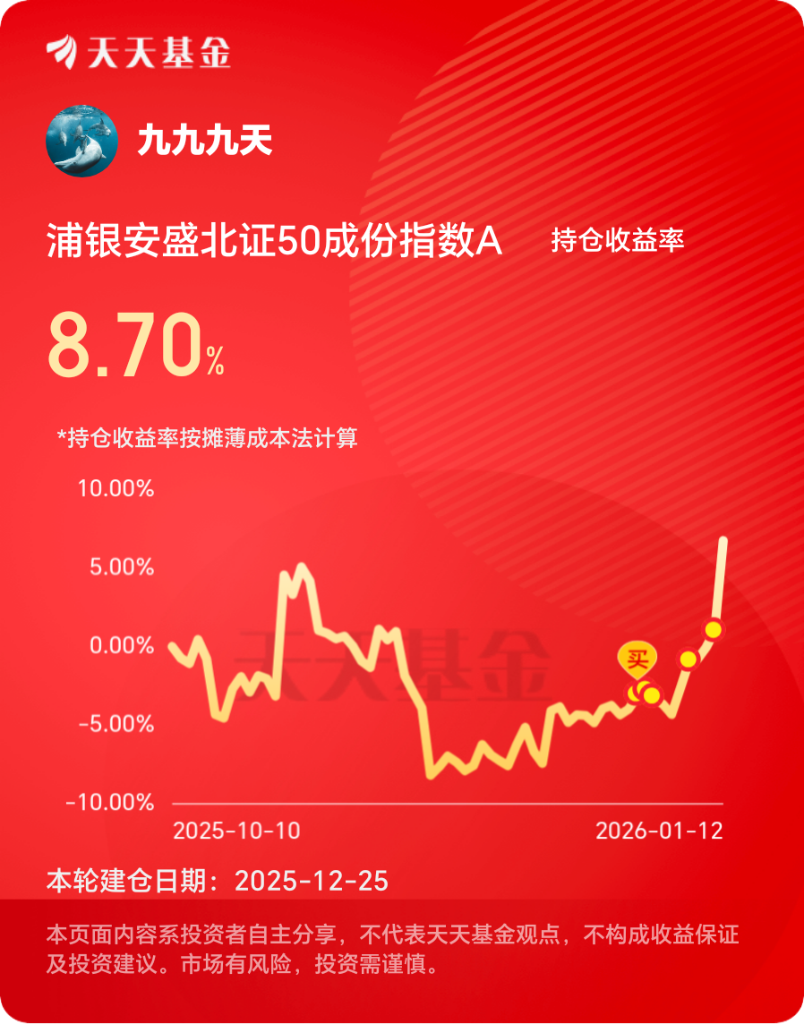 $浦银安盛北证50成份指数A$ 6连涨领跑,昨天大涨,低费率+无限购,趋势明朗#商业航天大幅调整 止盈信号还是倒车接人?# #晒收益#