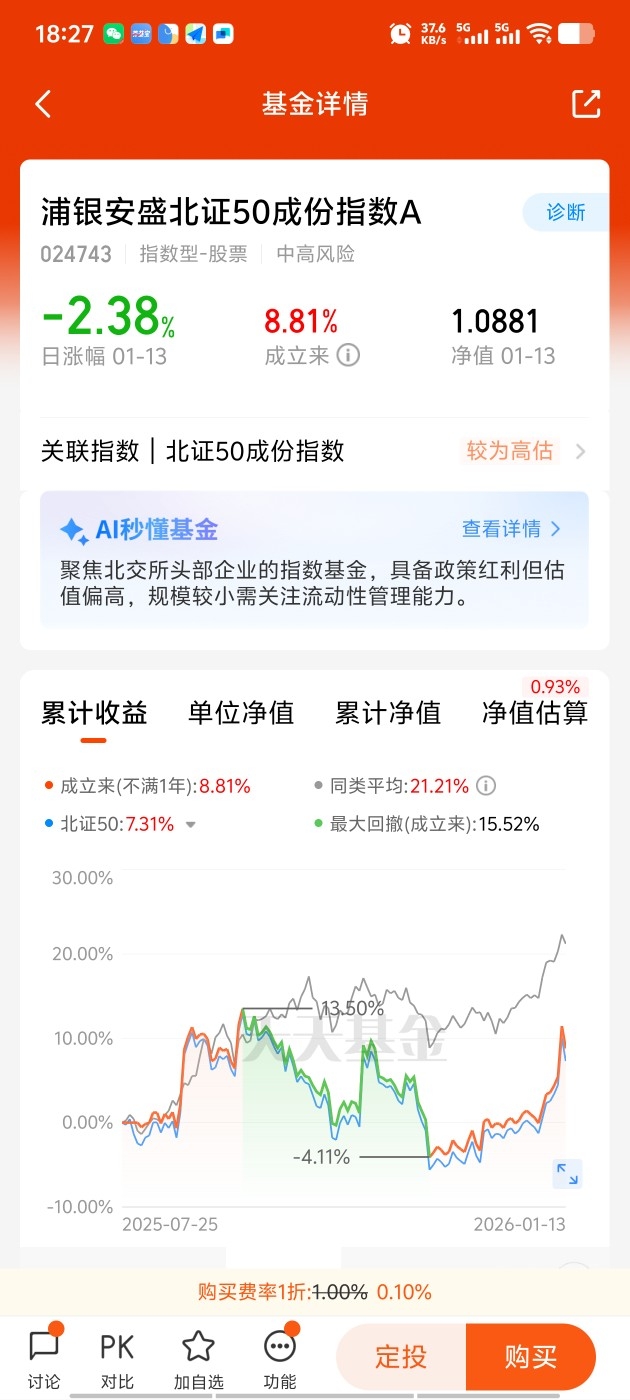选择布局正合适拿长期的$浦银安盛北证50C$今天上涨。7天免赎回费而且还不限购。