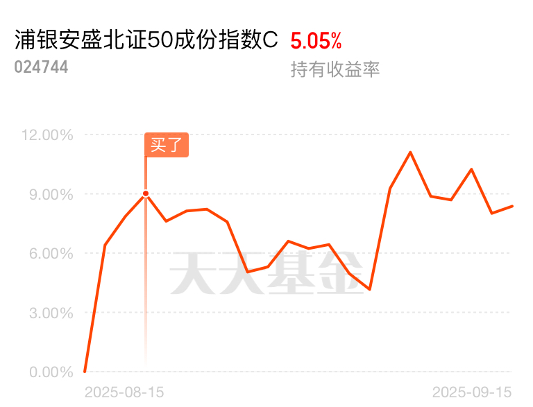 当前慢牛行情不改,适合配置北证50这种有弹性的成长风格指数,牛市看仓位,不限额的北证50给大家找到了,浦银安盛北证50跟踪紧密,成立以来跑赢指数,费率低不限额,7天免赎回费$浦银安盛北证50成份指数C$