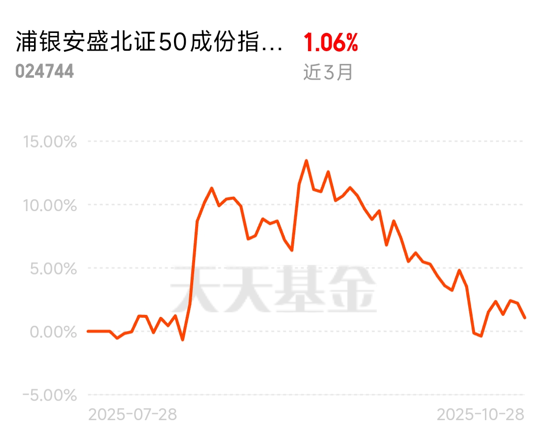 沉寂已久的北证50指数今日放量强势拉升,关注的$浦银安盛北证50成份指数C$ 涨近8%,弹性明显,也是快速收复失地。主要是北交所董事长在金融街论坛表示,将加快推出北证50ETF,并研究引入盘后固定价格交易,交易便利性有望提升增量资金流入可期,相应提振了市场信心。
