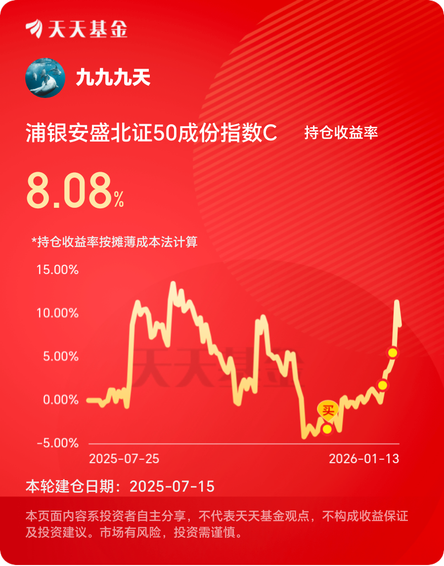 $浦银安盛北证50成份指数C$紧密跟踪指数,今日显著超额北证50,额度充足不限购